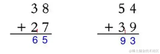 回想整数相加,如果我们手动在纸上运算,先将数字从个位数开始对齐,然后一一相加,结果大于10则进位,如下图: