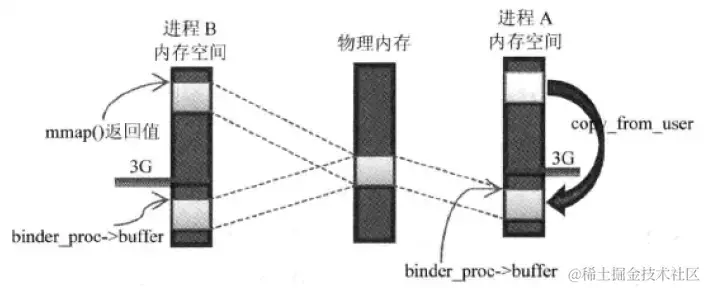 看上图,只需要把进程A的内存空间复制到内核空间中(copy from user),内核空间中有了进程A的东西,然后通过内存映射给进程B读取,所以说Binder通信只需要一次内存复制