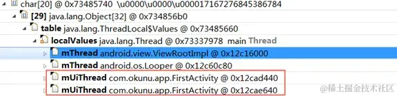 Char数组对象被FirstActivity的uiThread所引用,这明显不正常,还被好多个uiThread一同引用着,间接说明FirstActivity存在多个对象,它属于泄漏人员。那FirstActivity为啥泄漏呢?请见前文。
