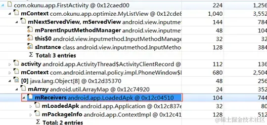 第一种方式,直接查看持有FirstActivity引用的对象,最终找到未注册的广播监听器。第二种方式,查看FirstActivity的gc路径,最后找到LoadedApk对象中的mReceivers对象(在context注册广播里会在LoadedApk保存相关对象),所以也相当于找出了内存泄漏原因。