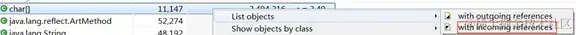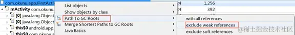 FirstActivity对象竟然有五个,这显示不对,右键选中FirstActivity,List objects,再选with incoming references,查看对象来源。