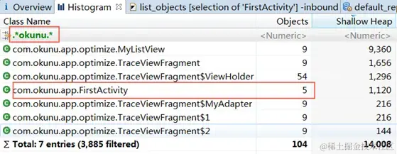 Mat主要有三个重要面板,Histogram,列出每个类实例的个数。Leak Suspects,疑似内存泄漏报告。Dominator Tree,列出消费内存最多的对象。根据个人经验,从Histogram入手,最容易也最快就能找到问题所在。Leak Suspects,也较为方便可以查到问题所在。而从Dominator Tree入手,较难查找。针对模拟问题,从Histogram查看,并搜索特定包名(本例中特定包名为okunu),因为系统对象一般不会泄漏。