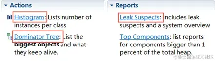 如果使用Leak Suspects查找内存泄漏原因,会稍显不直观,查看本例的Leak Suspects,发现占用最大的是char数组对象,于是打开Histogram,果然占用内存最大的即为char数组对象。