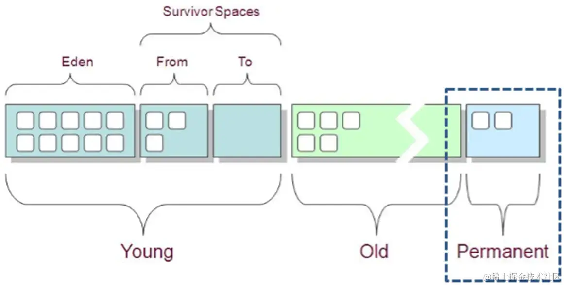 当前商业虚拟机的垃圾收集都采用分代收集算法。它根据对象存活周期的不同将内存划分为几块。