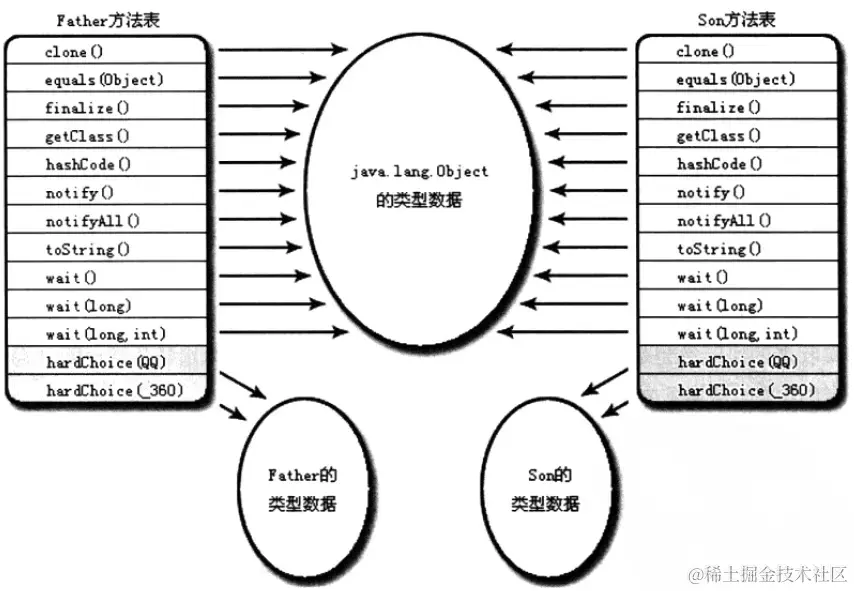 虚方法表上存着各个方法的实际入口地址。如果某个方法在子类中没有被重写,那么子类和父类的方法地址入口是一样的,都指向父类的实现入口。如果子类重写了这个方法,子类方法表中的地址将会被替换为子类版本的入口地址。