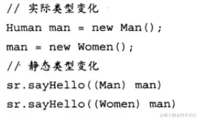 我们把上述代码中的 Human 称为变量的静态类型或者外观类型,后面的 Man 则称为变量的实际类型