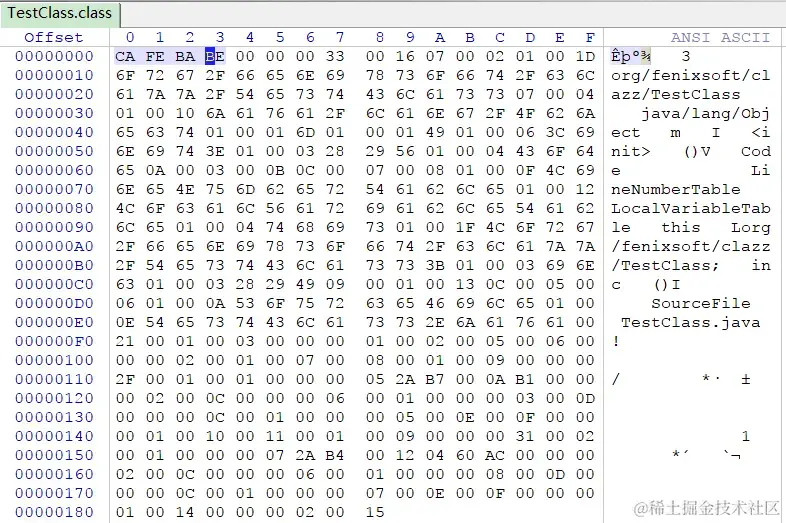 Class文件是字节码文件,需要使用16进制编辑器查看,本文中选用 WinHex,打开Class文件后整体如下: