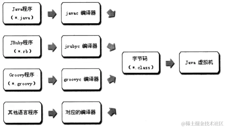 实现语言无关性的基础就是虚拟机和字节码存储格式,使用Java编译器可以把Java代码编译为存储字节码的Class文件,使用JRuby等的编译器一样可以把代码文件编译成Class文件,虚拟机并不关心Class文件的来源,只要它符合Class文件就有的结构就可以在Java虚拟机中运行。