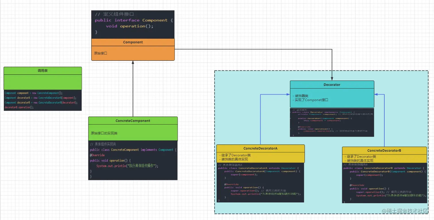 在上面的示例中,我们首先定义了一个Component接口和一个ConcreteComponent实现类,后者提供了基础的功能。然后,我们定义了一个Decorator装饰器类,并在其中包装了一个Component类型的引用,该类实现了Component接口并提供了与被装饰者相同的行为。