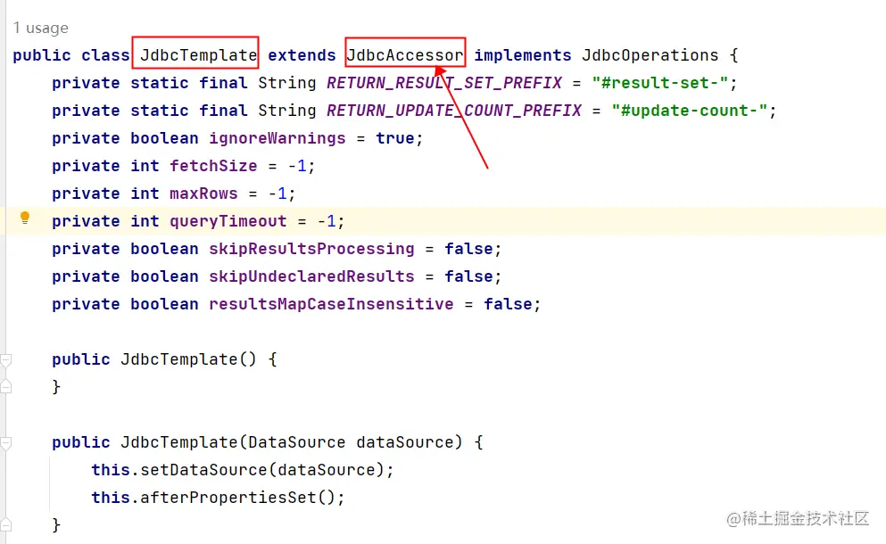 我们使用JdbcTemplate对象,完成增删改查,所以我们先分析一下源码: