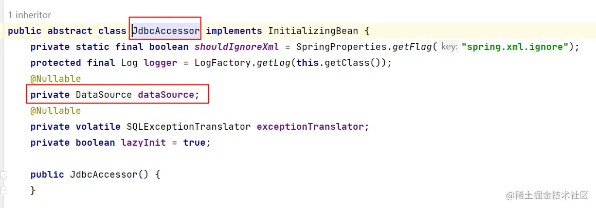 ①可以看到JdbcTemplate中有一个DataSource属性,这个属性是数据源,我们都知道连接数据库需要Connection对象,而生成Connection对象是数据源负责的,所以我们需要给JdbcTemplate设置数据源属性。