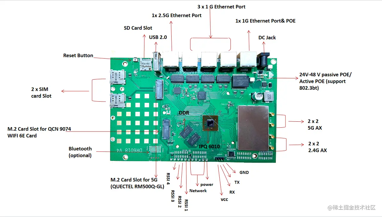 At the same time, the IPQ6010 chip is highly integrated with multiple built-in network interfaces, including multiple Ethernet ports and multiple WiFi ports. These interfaces can be used to connect to other devices and networks for wider network coverage and higher data transmission speeds.