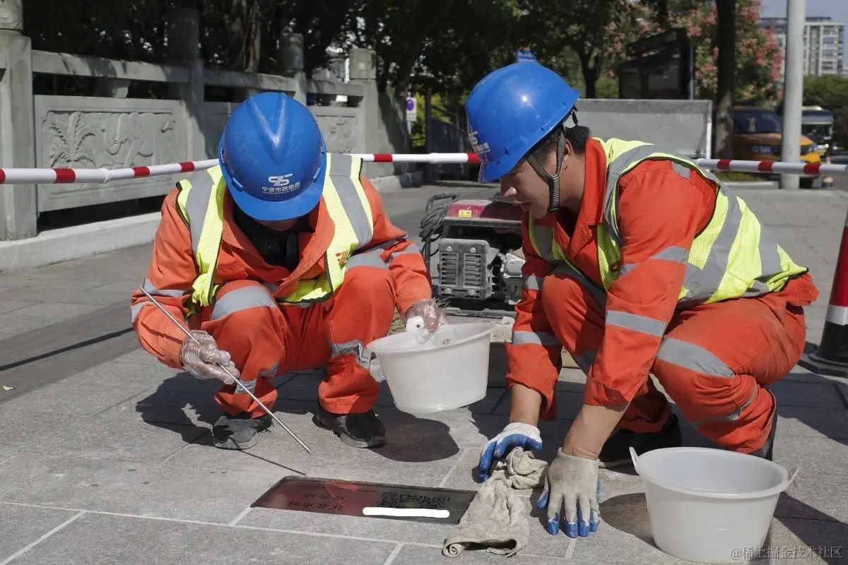 在施工工艺方面,江北区市政养护中心摒弃了传统的悬挂、贴附等安装方法,而是采用高透明环氧树脂将不锈钢铭牌嵌入桥面铺装中。这种方式既能保护铭牌表面,延长铭牌使用寿命,还能确保桥梁上的二维码长期有效地为桥梁服务。同时,在不破坏桥梁外观的前提下,方便了桥梁的养护工作。