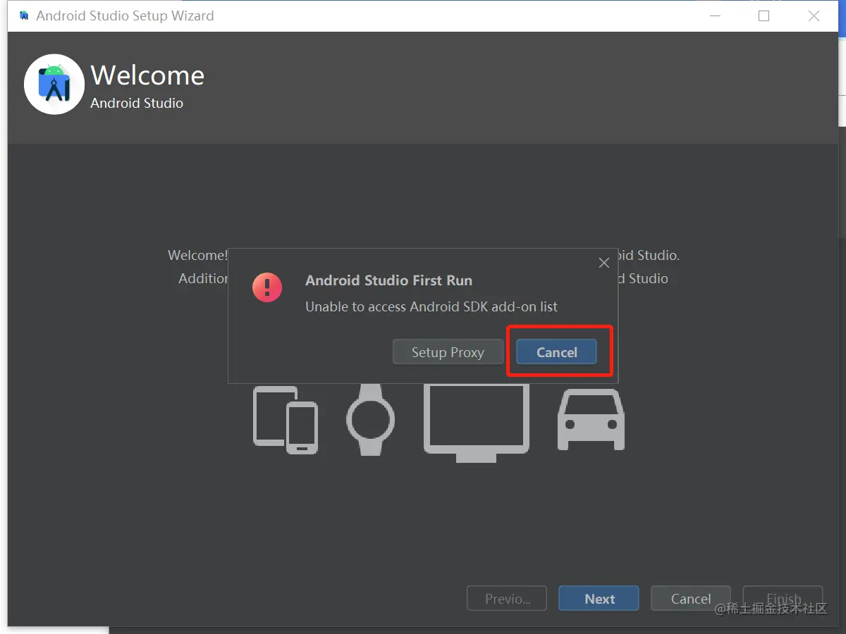 空白电脑不需要任何配置(首次启动时,会弹出提示框,提示没有检查到Android SDK,因为我们还没有单独配置Android SDK.所以单击Cancel按钮,继续安装即可。Android SDK 就是 Android 专属的软件开发工具包)