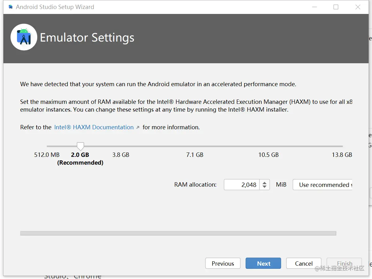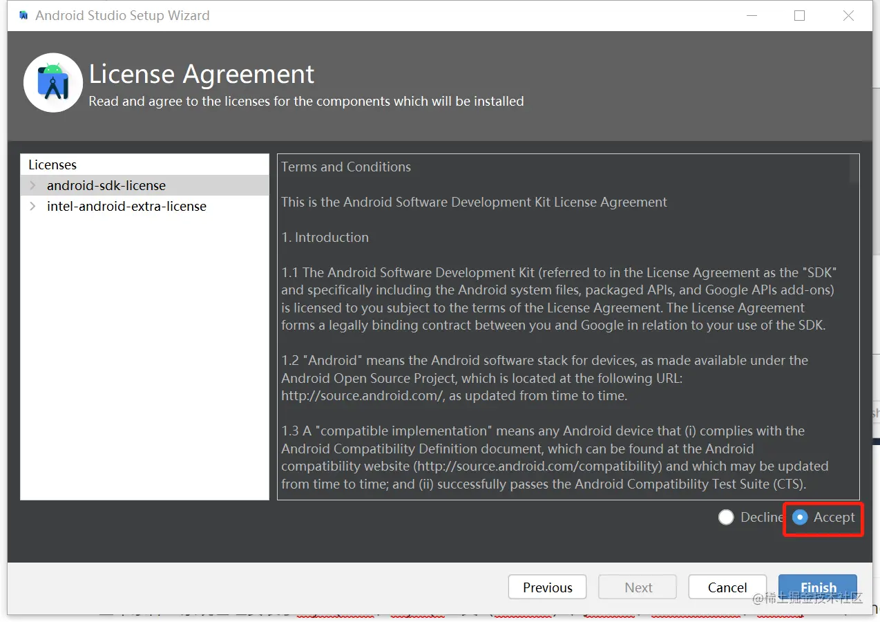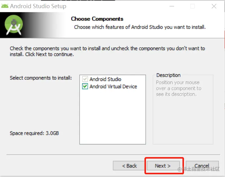 选择安装的组件(第一个SDK必选,其他根据自己需要,_Performance为intel 虚拟机硬件加速部分;_Android Virtual Device为Android虚拟机)