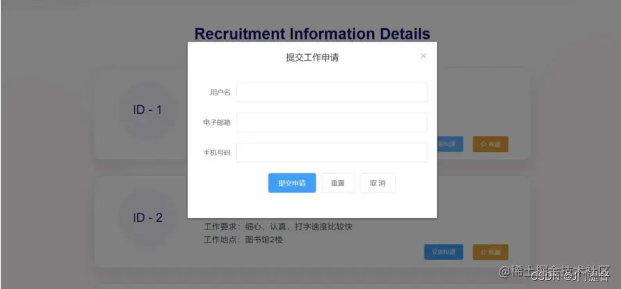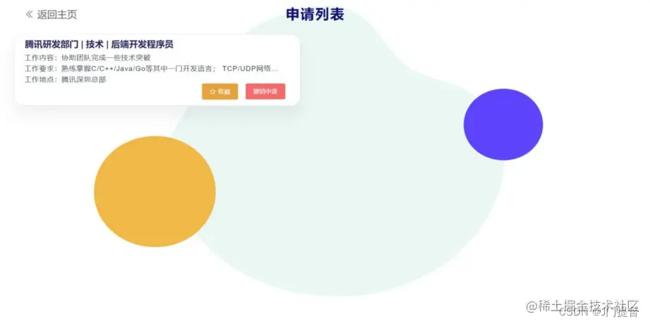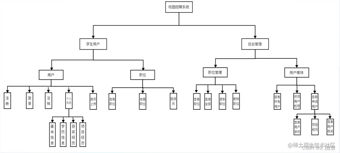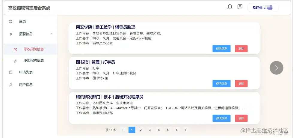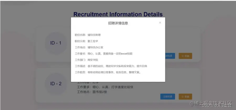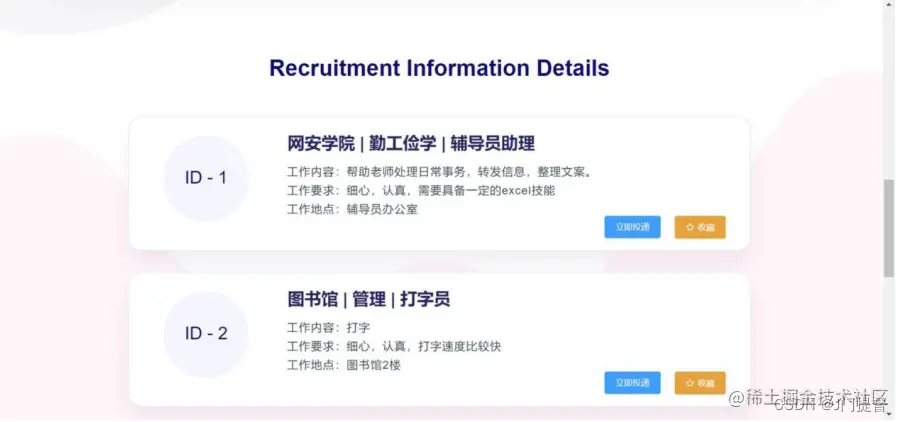 前台工作主要是完成学生端对工作岗位的浏览,投递和收藏,其中浏览又细分为校内岗位和校外岗位等等。