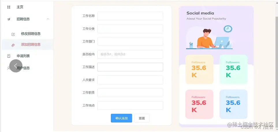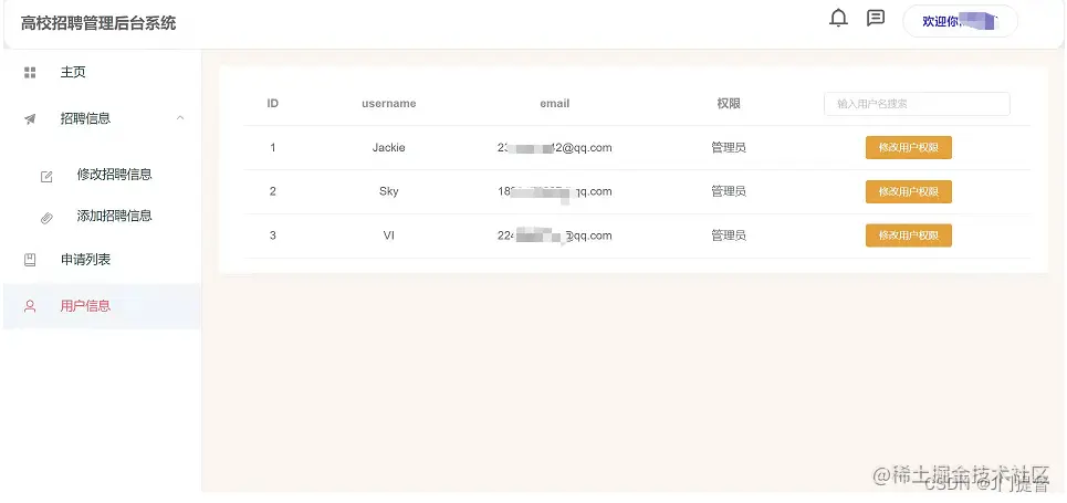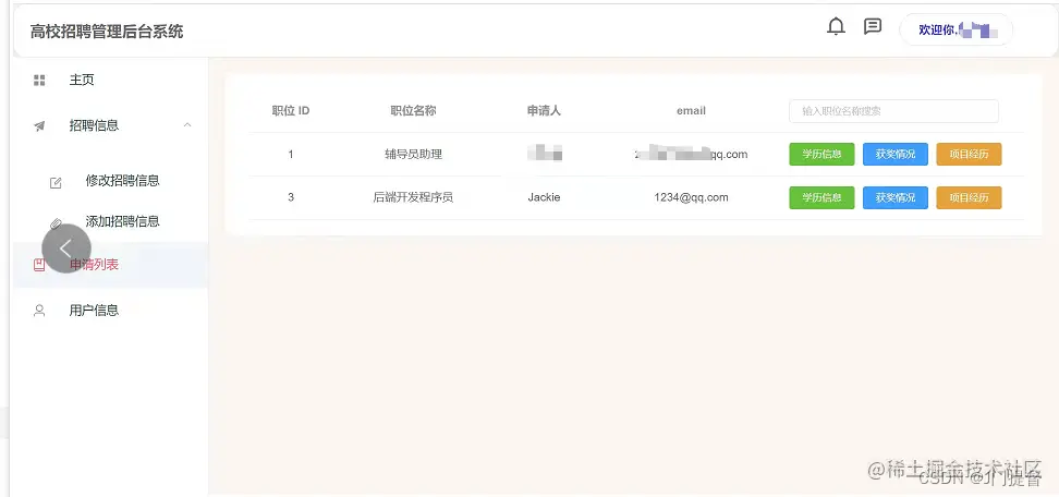 后台主要功能是对招聘信息的发布和管理,以及对职位申请的审批,查看用户的个人主页,还有权限管理功能,这个权限管理没有用到框架(spring security和shiro),主要是数据库的表的字段判定。