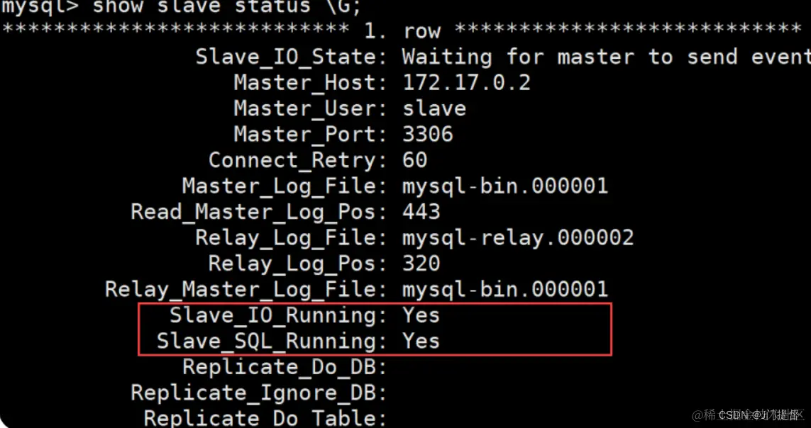 下图所圈的两个线程必须为yes状态,否则主从复制搭建不成功。