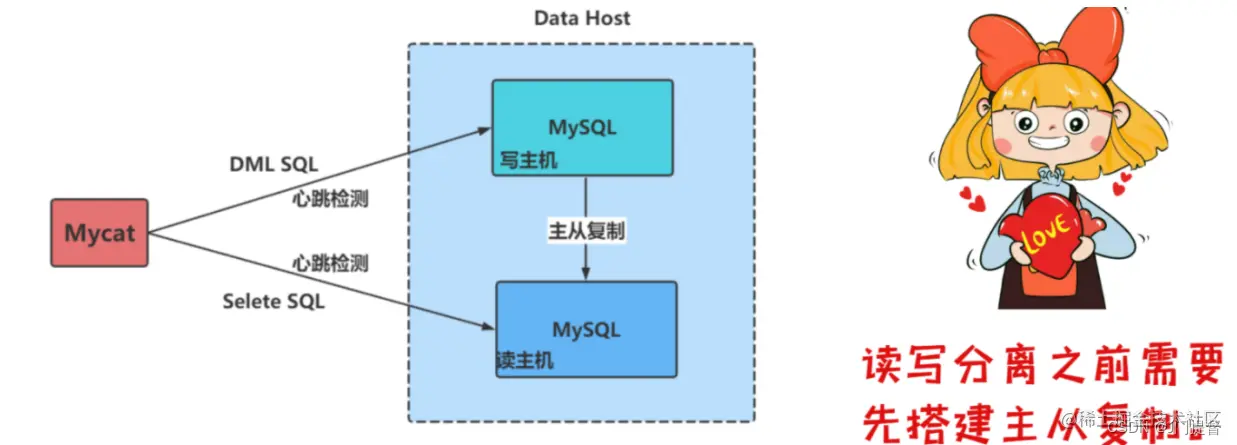 示例:读写分离 是基于mysql数据库主从复制实现的一个功能,该功能让主数据库处理事务性增、改、删操作,从数据库处理查询操作。它是Mycat的一个重要功能之一,保证了一个数据库宕机,系统还可以从另一个数据库获取数据。保证了数据的安全和系统的稳定。