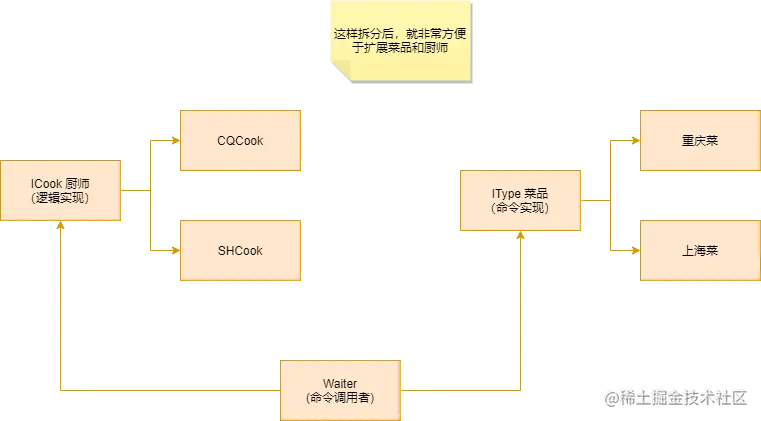 - 拆分后,整个框架的代码都是松耦合的,且每个都是单一职责的,菜品和厨师都可以很方便的扩展搭配。