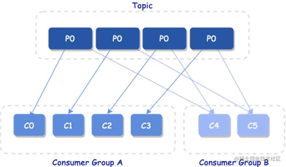 如图 10 所示,某个主题中共有 4 个分区(Partition):P0、P1、P2、P3。有两个消费组 A 和 B 都订阅了这个主题,消费组 A 中有 4 个消费者(C0、C1、C2 和 C3),消费组 B 中有 2 个消费者(C4 和 C5)。按照 Kafka 默认的规则,最后的分配结果是消费组 A 中的每一个消费者分配到 1 个分区,消费组 B 中的每一个消费者分配到 2 个分区,两个消费组之间互不影响。每个消费者只能消费所分配到的分区中的消息。换言之,每一个分区只能被一个消费组中的一个消费者所消费。