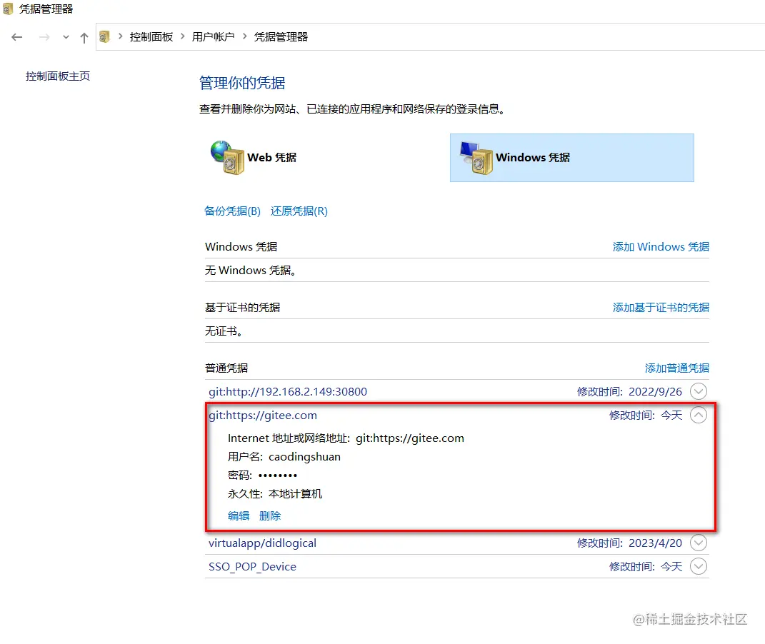进入控制面板=>点击用户账号=>点击凭据管理器(页面右半部分)=>点击管理Windows凭据。可在右半部分内容,普通凭据中看到之前输入的git账号密码。