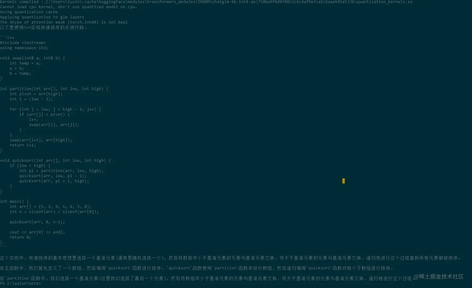 response, history = model.chat(tokenizer, "用C++实现快速排序", history=[])