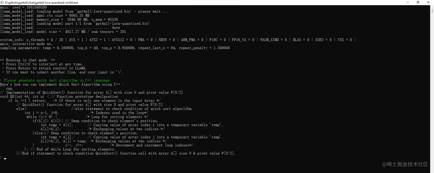 第四步,运行gpt4all-lora-quantized可执行文件。以Windows平台为例,就是运行gpt4all-lora-quantized-win64.exe。可以在powershell中执行,也可以直接点击。