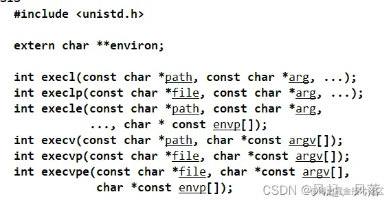 int execvp(const char *file, char *const argv[]); 带p:代表当执行程序的时候,只需要指定程序名即可,系统会自动在PATH环境变量中查找 v代表vector 容器