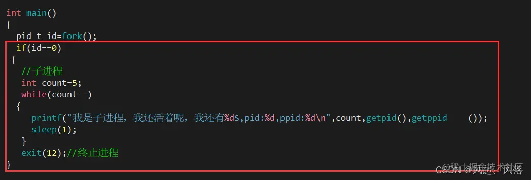 红框中的代码实际上是父进程的代码,在没有执行fork之前代码就有了,在没有创建子进程之前,父进程的代码加载到内存了,子进程被创建出来是没有独立的代码,这个代码是父进程的代码,父进程通过if判断分流让子进程去跑了