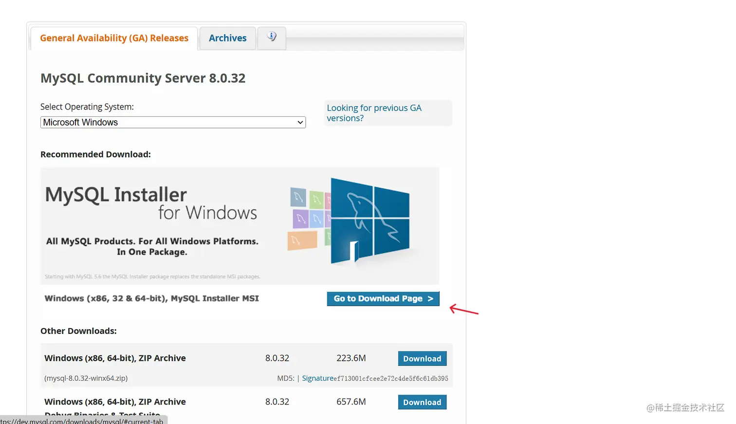 7、MySQL MSI下载,点击 Go to Download Page 进入下载页面