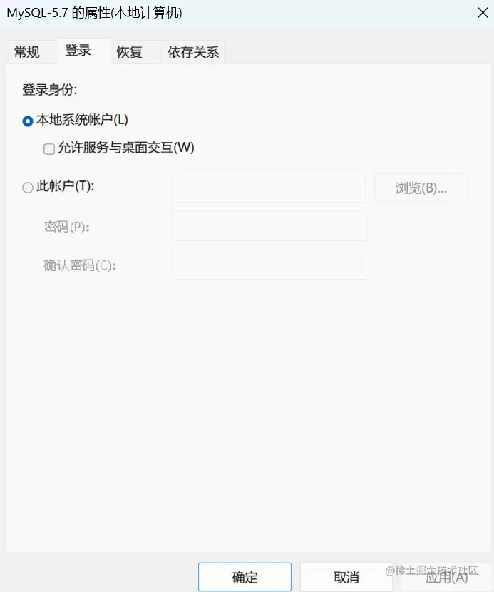 4、找到MySQL右键,点击属性,选择登录,选择本地系统账户。