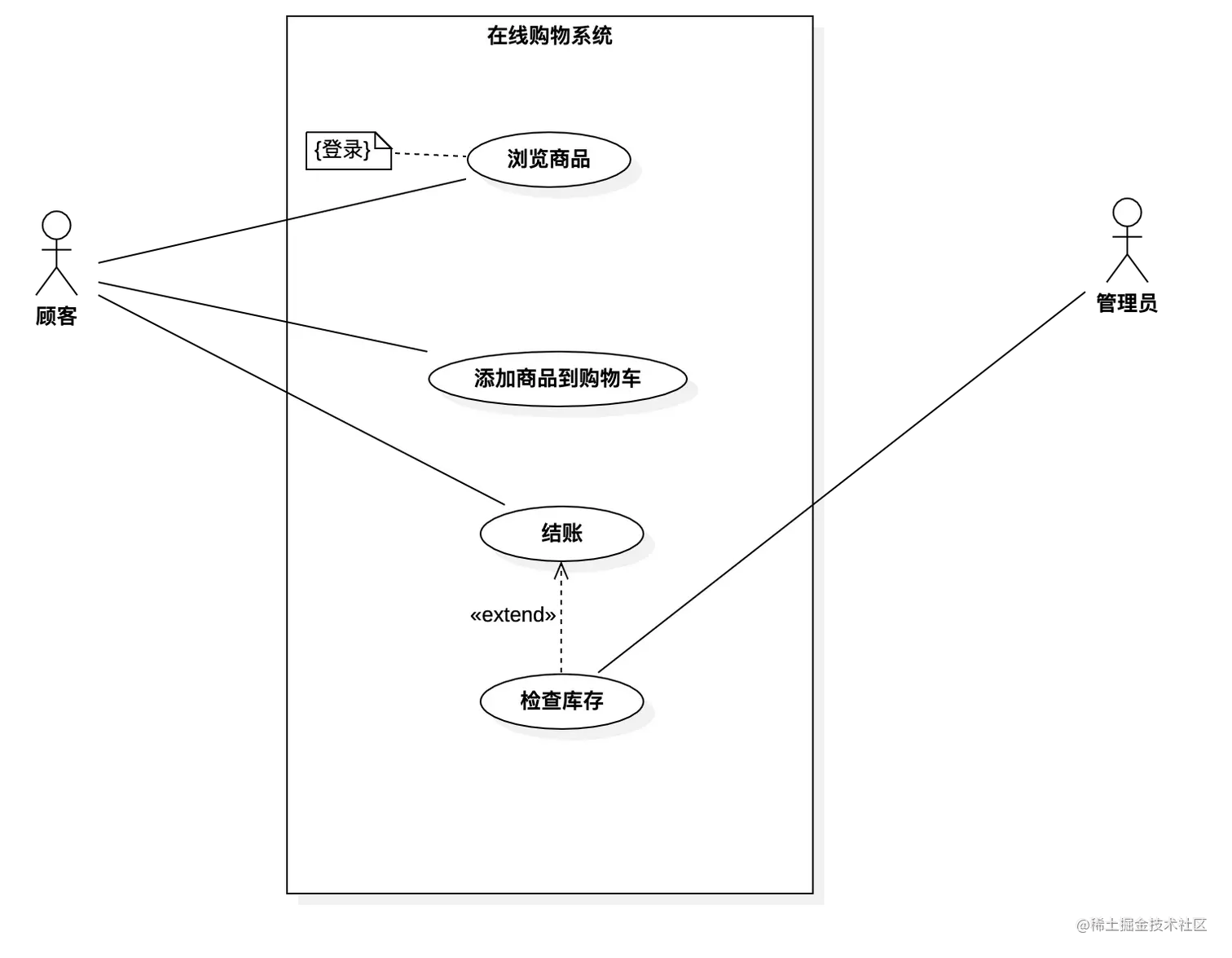 - 确定系统边界和参与者: 系统边界是在线购物系统本身,而参与者包括客户和管理员。