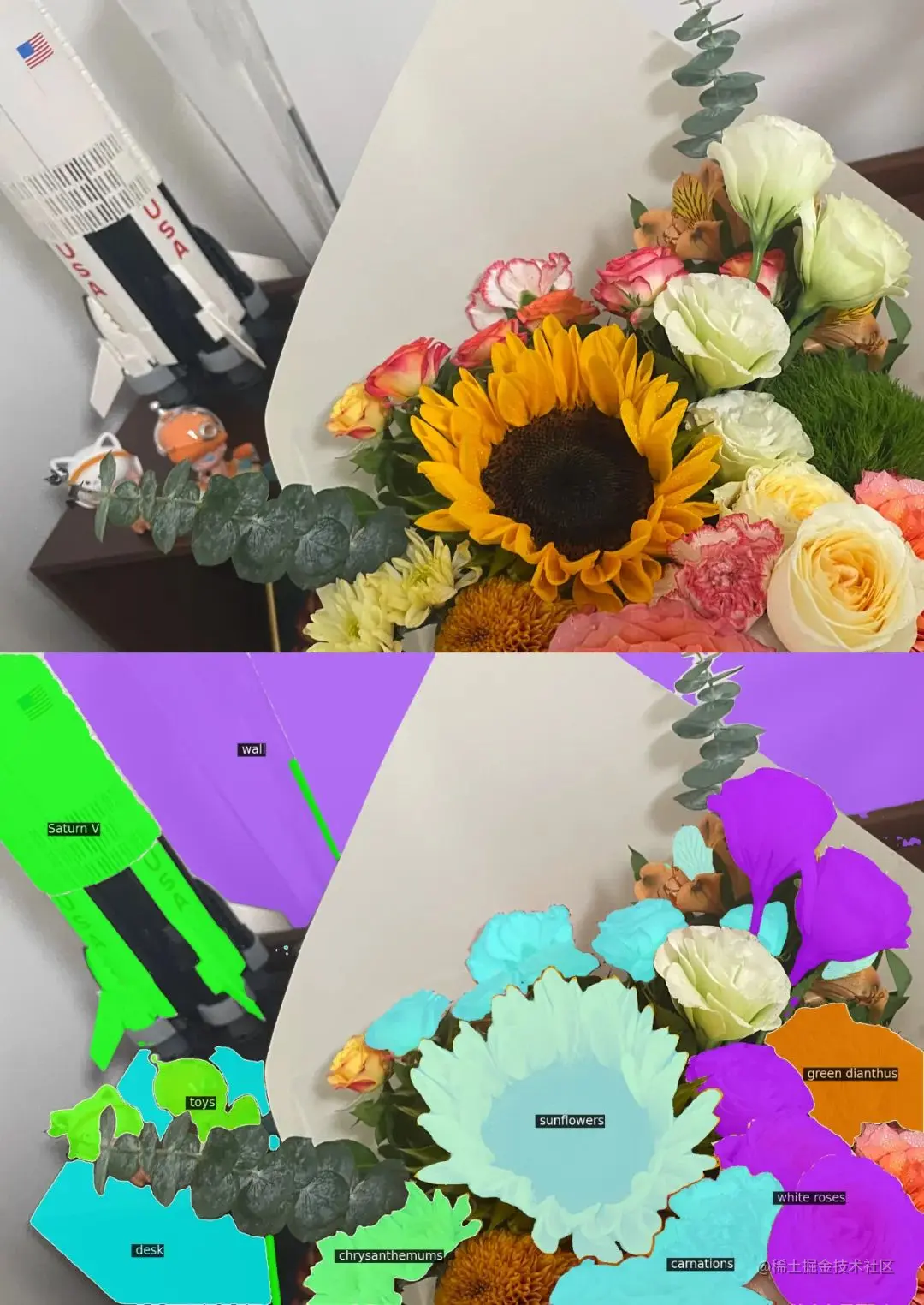 从效果上来看,OVSeg 可以与 Segment Anything 结合,完成细粒度的开放语言分割。比如下图 1 中识别花朵的种类:sunflowers (向日葵)、white roses (白玫瑰)、 chrysanthemums (菊花)、carnations (康乃馨)、green dianthus (绿石竹)。