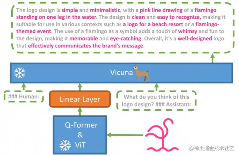 MiniGPT-4 使用一个投影层将一个冻结的视觉编码器和一个冻结的 LLM(Vicuna)对齐。MiniGPT-4 由一个预训练的 ViT 和 Q-Former 视觉编码器、一个单独的线性投影层和一个先进的 Vicuna 大型语言模型组成。MiniGPT-4 只需要训练线性层,用来将视觉特征与 Vicuna 对齐。