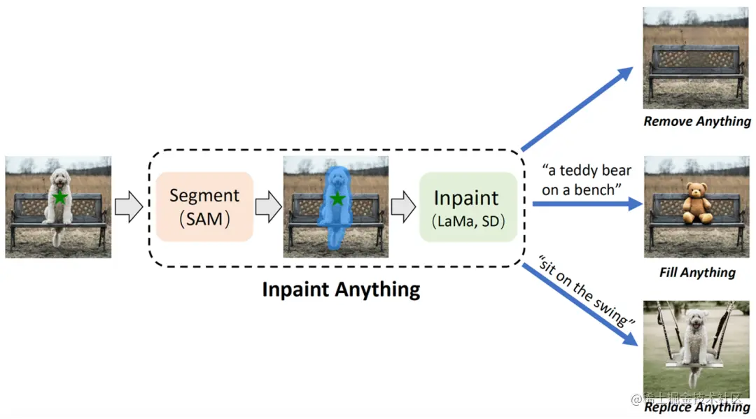 IA 拥有三个主要功能:(i) 移除一切(Remove Anything):用户只需点击一下想要移除的物体,IA 将无痕地移除该物体,实现高效「魔法消除」;(ii) 填补一切(Fill Anything):同时,用户还可以进一步通过文本提示(Text Prompt)告诉 IA 想要在物体内填充什么,IA 随即通过驱动已嵌入的 AIGC(AI-Generated Content)模型(如 Stable Diffusion [2])生成相应的内容填充物体,实现随心「内容创作」;(iii) 替换一切(Replace Anything):用户也可以通过点击选择需要保留的物体对象,并用文本提示告诉 IA 想要把物体的背景替换成什么,即可将物体背景替换为指定内容,实现生动「环境转换」。IA 的整体框架如下图所示: