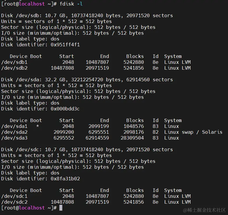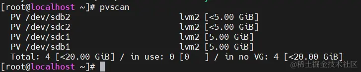 把4个PV创建到一个vg中 vgcreate vgdata /dev/sdb1 /dev/sdb2 /dev/sdc1 /dev/sdc2