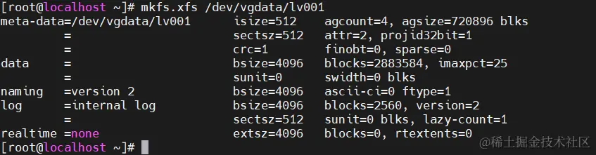 使用mkfs /dev/vgdata/lv01命令格式化lv01