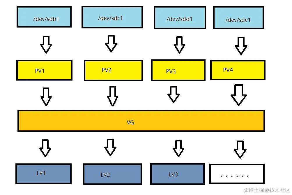PV(Physical Volume):物理卷,处于LVM最底层,可以是物理硬盘或者分区。