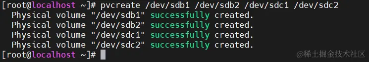 pvcreate /dev/sdb1 /dev/sdb2 /dev/sdc1 /dev/sdc2
