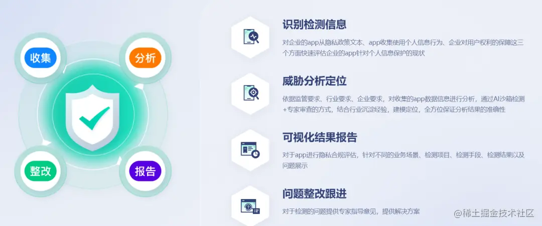 **应用合规检测。**基于多个监管文件,进行App日常合规检测、整改、二次检测和抽检等,防止对客户信息过度收集。