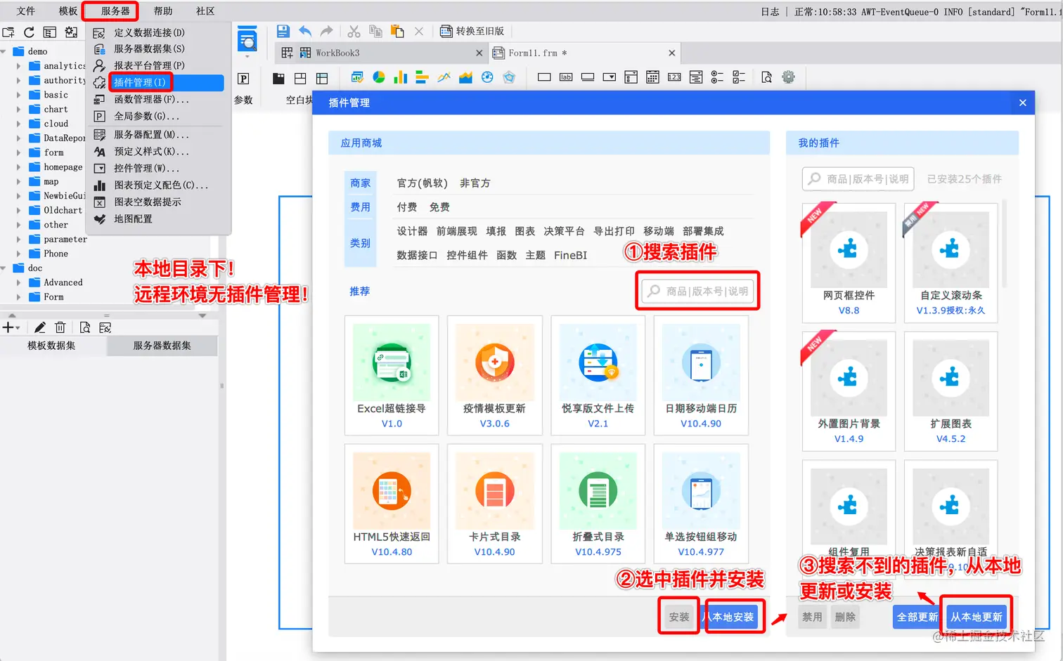 设计器内置的组件可能并不能满足我们制作大屏模板的需求,为实现更好地大屏效果,我们还需要安装一些常用插件,扩展图表、组件复用和决策报表新自适应插件是大屏制作常用的三个插件:扩展图表、组件复用和新自适应插件。
