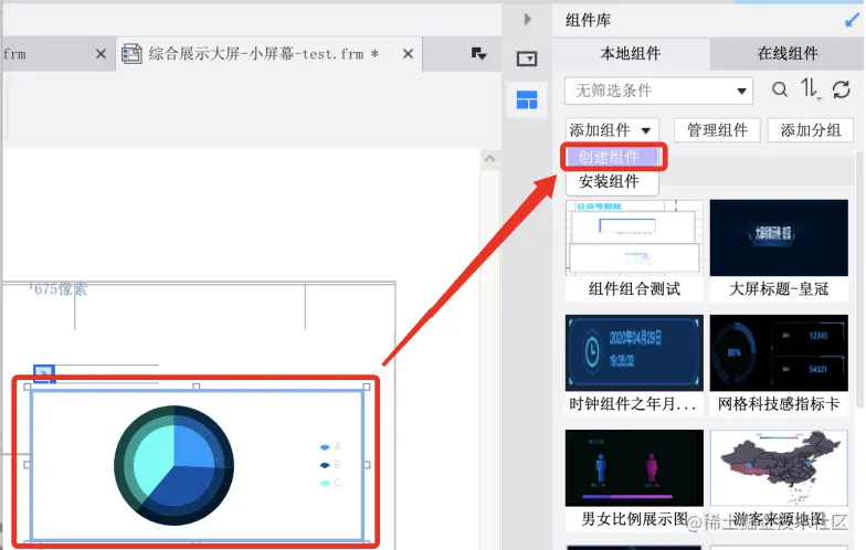 如果想直接看到组件复用的效果,选中任意本地模板的组件,「添加组件」-「创建组件」将本地模板中的组件连同数据源一起保存到「组件库」-「本地组件」中: