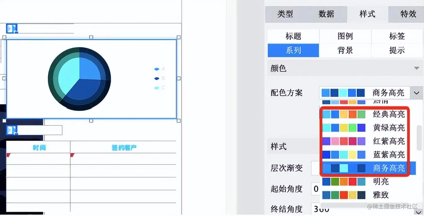 还需根据大屏的色彩风格调整图表的系列配色,可以使用设计器内置的配色方案,其中「xx高亮」系列为大屏专属的配色;
