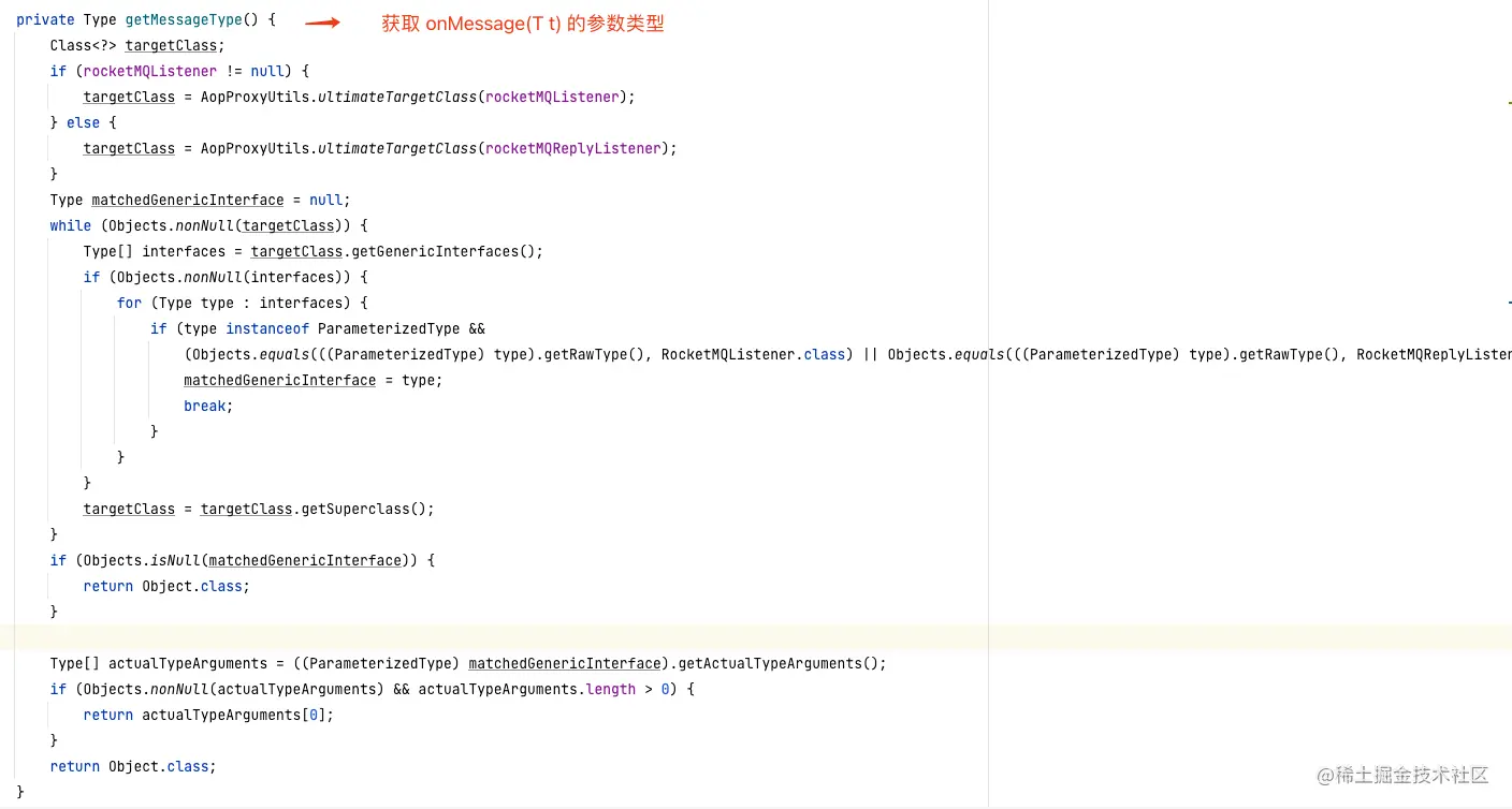 首先DefaultRocketMQListenerContainer初始化之后, 获取 onMessage 方法的参数类型 。