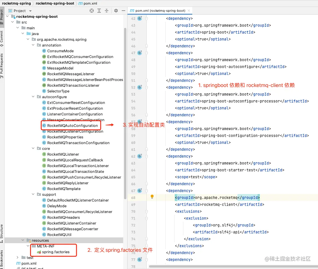 3、starter 设计思路 :定义自动配置文件 spring.factories 、设计配置属性类 、在 RocketMQ client 的基础上实现优雅的封装、深入理解 RocketMQ 源码等;