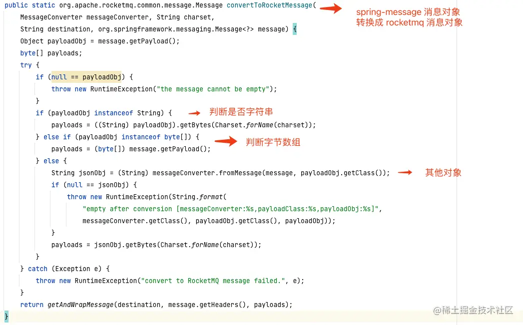 发送消息时,将 spring-message 规范下的消息对象封装成 RocketMQ 消息对象