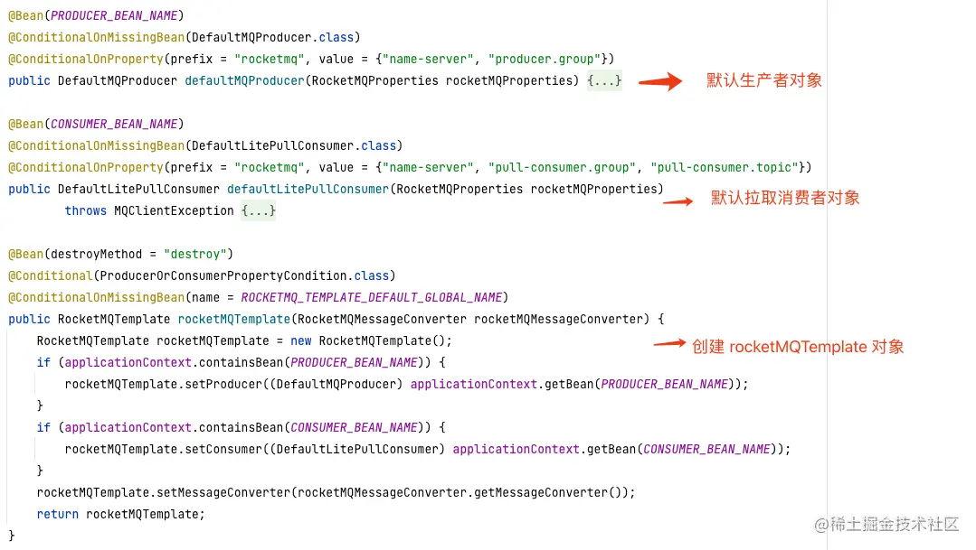 在 RocketMQAutoConfiguration 类的具体实现中,我们重点分析下生产者和消费者是如何分别启动的。