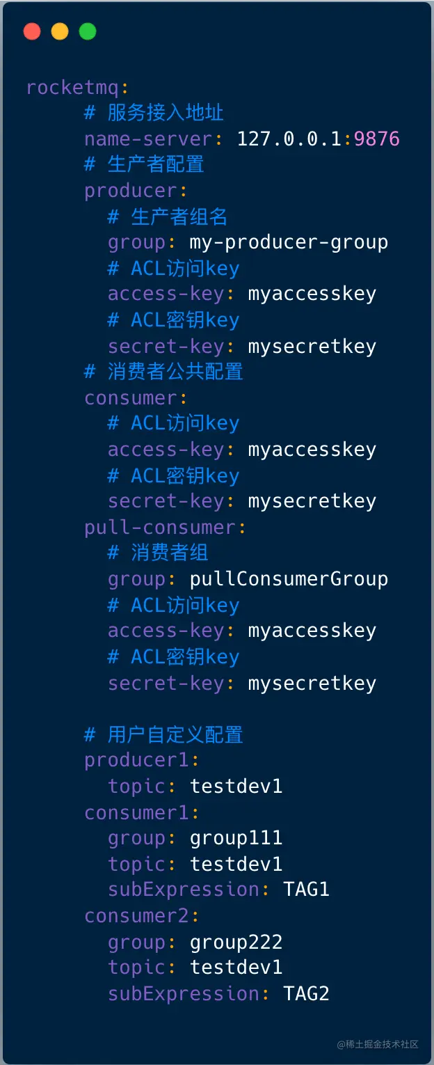 下面我们看下 rocketmq-spring-boot-starter 的配置: