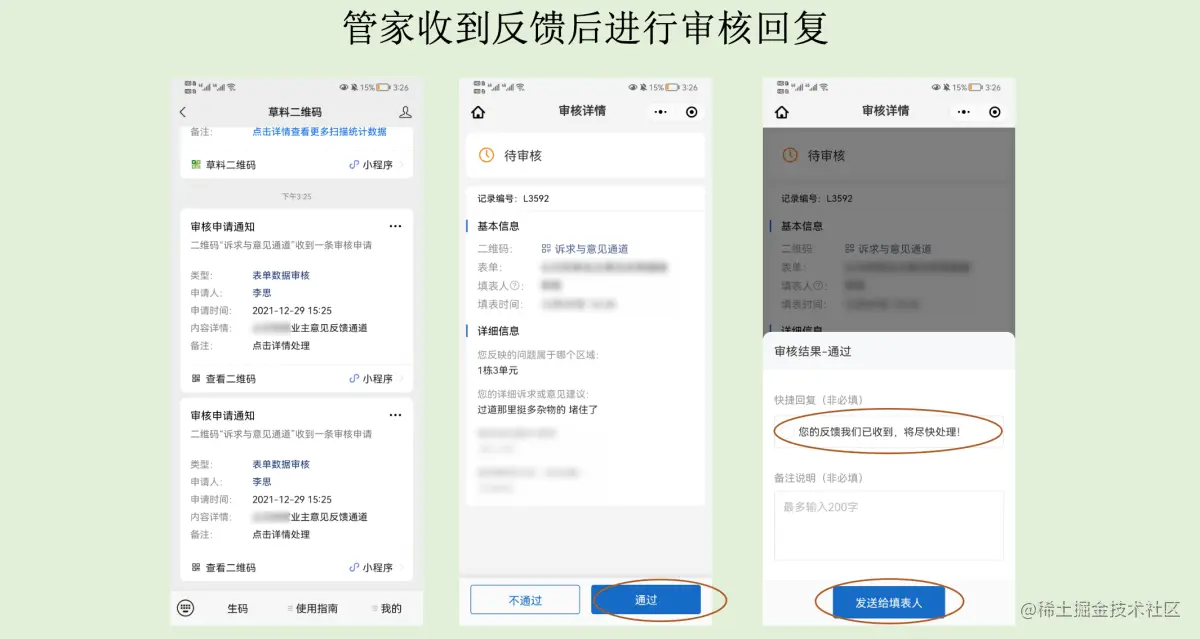当业主扫码提交建议后,物管可以在微信上实时收到提示消息,而同样的当物管进行回复时,填写人也能收到实时的反馈回复。